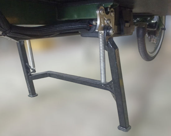 Wer sich mit Lastenrädern auskennt, weiß einen guten Ständer zu schätzen: Ein präziser Kipppunkt und austarierte Federn sorgen für Stabilität beim Be- und Entladen auch unter Volllast