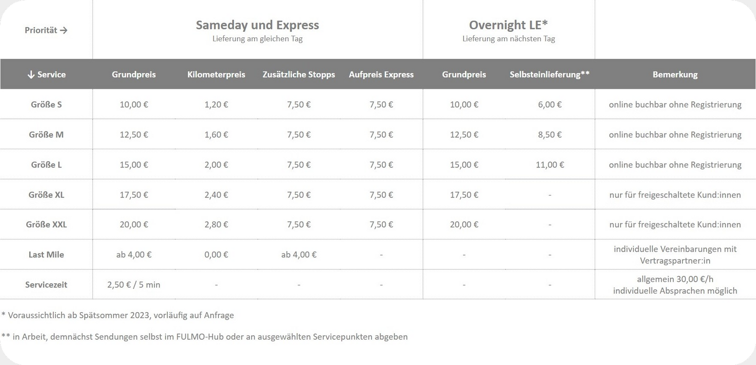 - Die Höhe des Preises wird beeinflusst von Gewicht / Größe (Service) und dem zeitlichem Rahmen (Priorität) der Zustellung