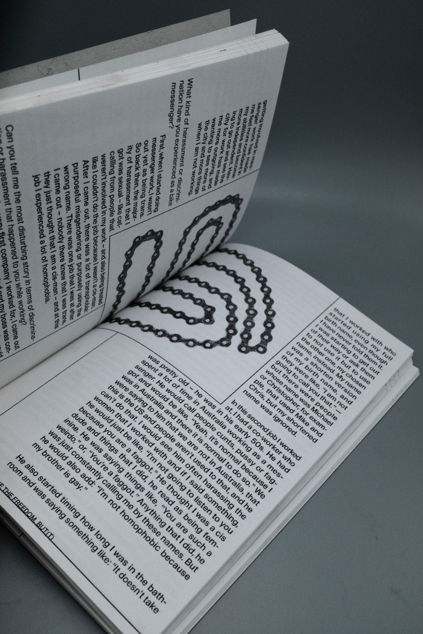 The book contains stories from 13 bike messengers all around the world, talking about their experiences in the form of interviews. It is a social book-project, where any profits made from this book will be donated to organizations who help people with similar issues.